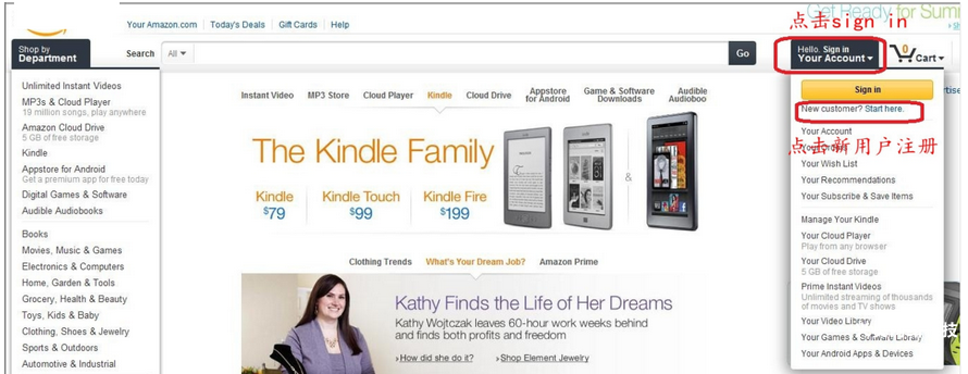 1、首先进入美国亚马逊首页,进行注册账户。点击首页的右上部有一个下拉菜单“Hello,Sign in”,菜单中包括了账户注册、登陆,你的账户,你的订单,你的心愿单,你的购物建议等等常用的购物功能。