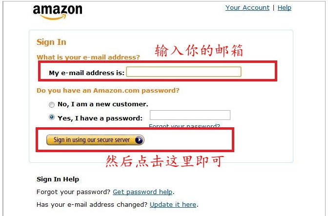 2、点击New customer? Start here.后,亚马逊会提示你是否使用之前登陆过的账户登陆,在这里我们选下面的“Yes,I have a password"(是的,我是一个新用户)。