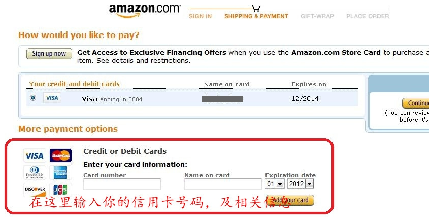 8、填写你的账单信息,填入你的信用卡账号名称,也可以使用giftcard:fires!填写完毕之后点击页面continue 再确认订单即可购买成功。