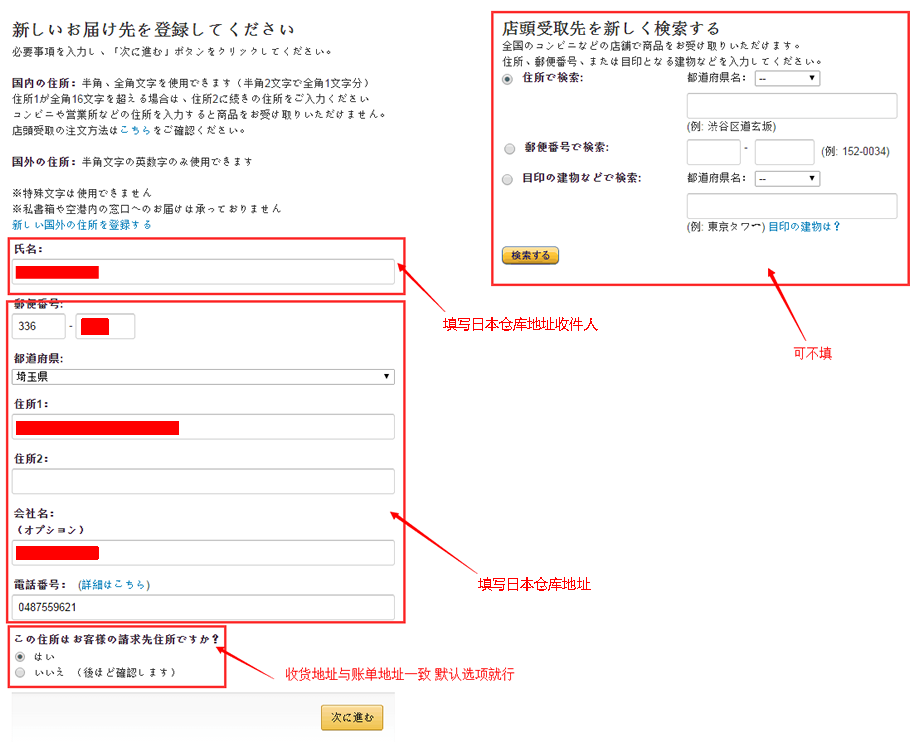 6、接下来填写收货地址(转运公司地址),需要注意的是住所2处需要添加的是仓库地址的代码,此处代码是你在仓库的唯一身份验证,收发包裹均以此代码识别包裹主人。
